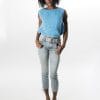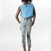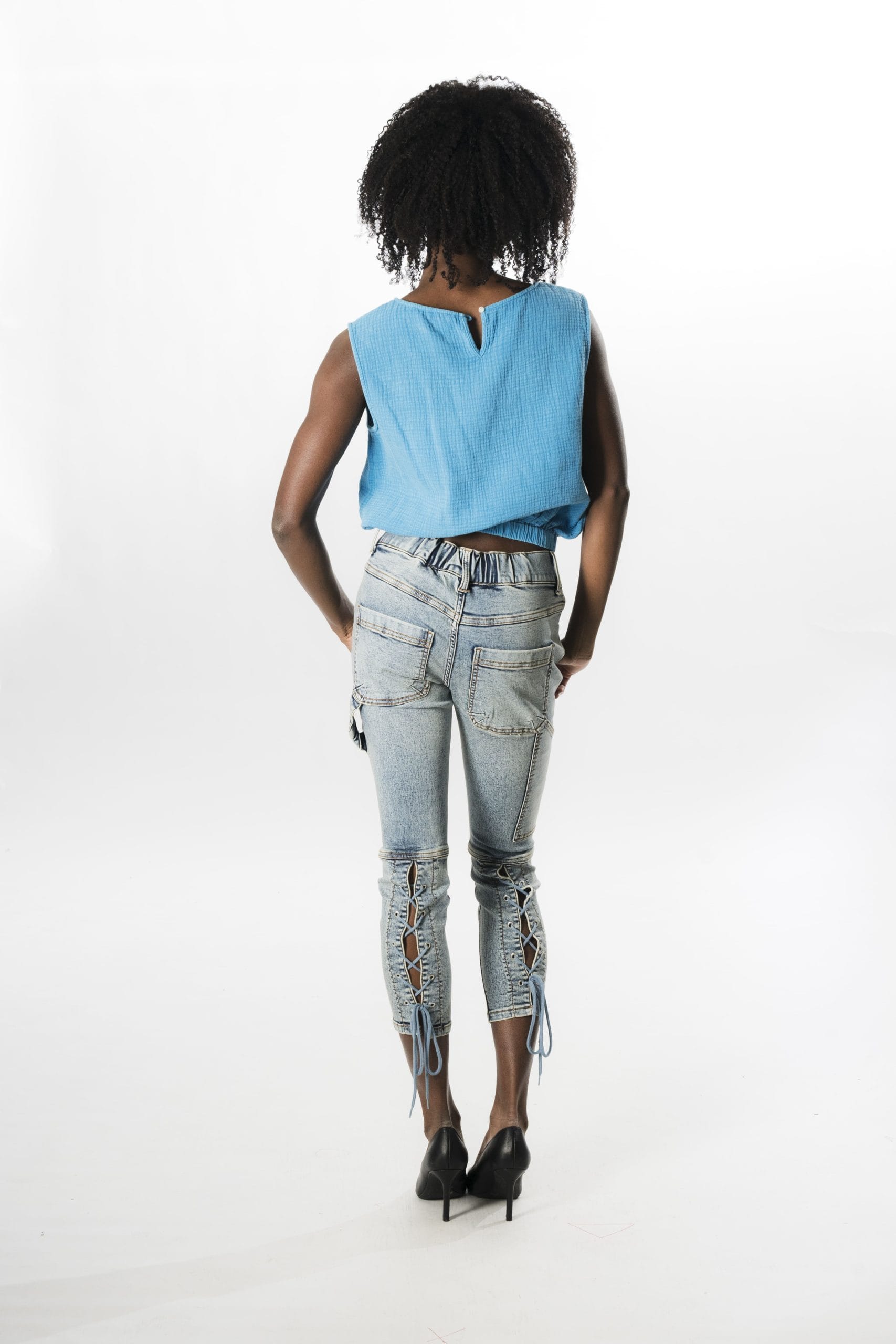 Contrasting washes give this capri standout style. A tie-up detail and back drawcord offer adjustable fit and a playful look.